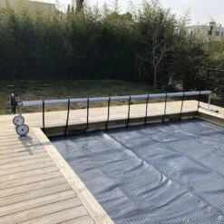 La couverture solaire Gré flotte sur l’eau, les bulles faisant office d’isolant thermique.