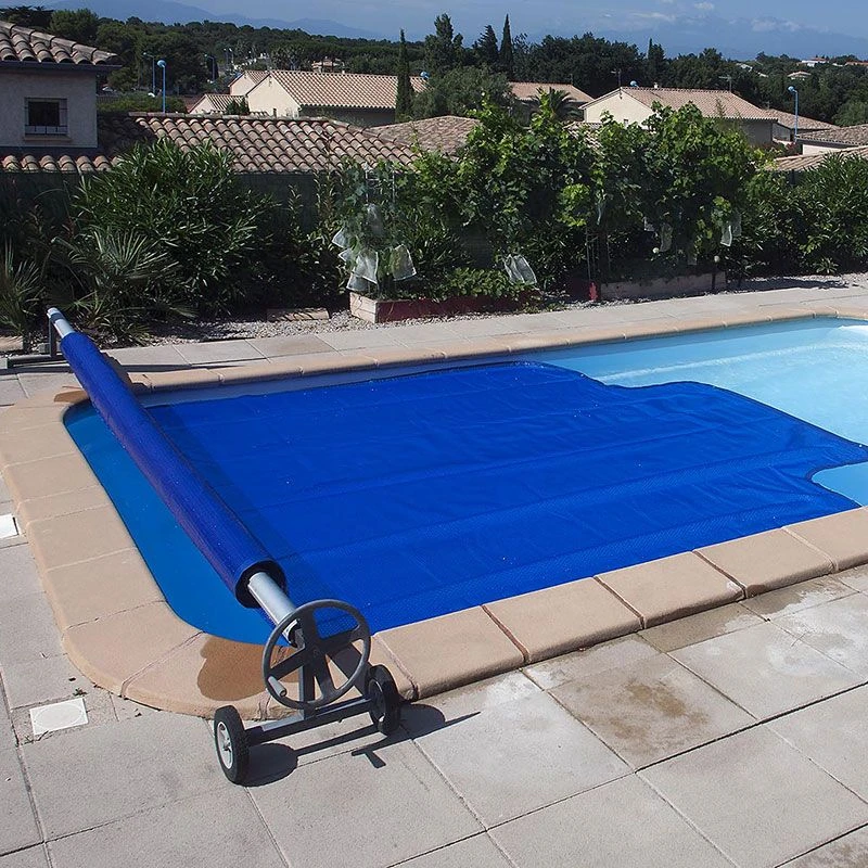 La bâche à bulles est l’élément clé de la piscine en été. C’est l’accessoire de base multifonctions qu’il faut absolument utiliser pour profiter au maximum de sa piscine tout en faisant des économies. Nous avons préparé pour vous une sélection de bâches aux dimensions les plus courantes pour que vous puissiez trouver en un instant la couverture qu’il vous faut disponible en livraison express car déjà fabriquée et bien au chaud dans nos entrepôts en attendant de vous être expédiée. Grâce à son épaisseur de 400 ou 500 microns aux standards du secteur, elle vous offre des performances isothermes remarquables pour une conservation de la chaleur lorsque vous couvrez votre piscine la nuit. L’épaisseur est un élément déterminant dans le choix de votre couverture d’été car si elle est trop faible la bâche risque de se déchirer au fur et à mesure des manipulations. Au contraire si elle est trop épaisse, elle résistera mieux aux manipulations mais pourra s’avérer trop lourde pour être manipulée seule ou sans enrouleur. Les experts Azialo vous recommandent de rechercher le parfait compromis entre la résistance et poids pour manipuler aisément la bâche et la conserver longtemps. La couverture à bulles se pose face bulles positionnée en contact avec l’eau et face lisse vers le ciel. Le plastique utilisé pour la fabrication de la couverture solaire est adapté à son usage et il est traité anti-UV pour un maximum de solidité.